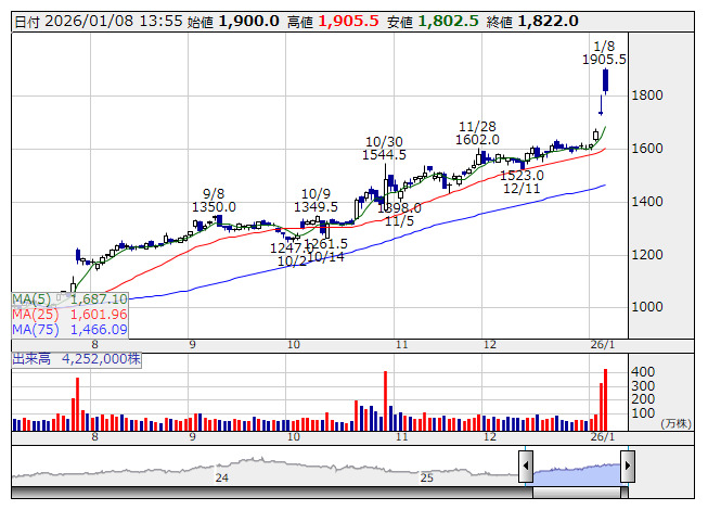 2026年01月08日13時55分 【材料】大同特殊鋼---大幅続伸、レアアース使わない磁石開発企業として物色 大同特鋼 <日足> 「株探」多機能チャートより 大同特殊鋼<5471>は大幅続伸。中国が軍民両用物資の日本に対する輸出禁止措置を発表し、東京市場ではレアアース関連銘柄の物色が活況となっている。日本のレアアース中国依存度は一時から低下した現在でも60%程度あるとされている。同社は、レアアースと切り離せないとされる磁石の製造で、重希土類を使わない磁石を開発している。今後の本格的な需要シフトが期待される状況となっているもよう。 《HM》 提供:フィスコ