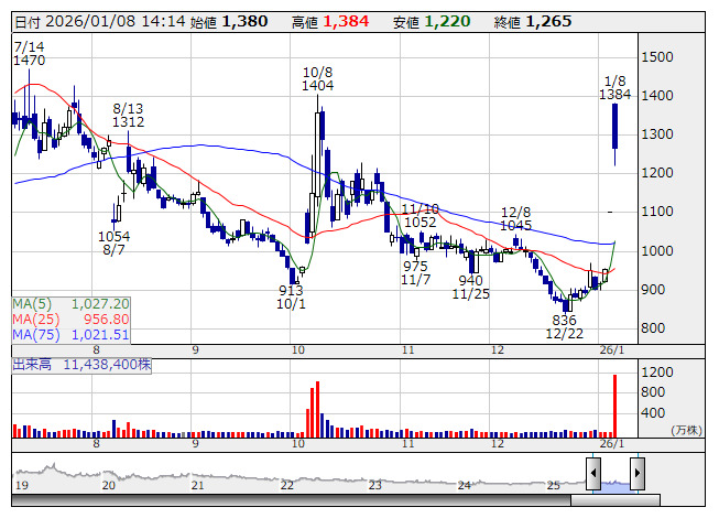 ■出来高変化率上位 [1月8日 13:32 現在]