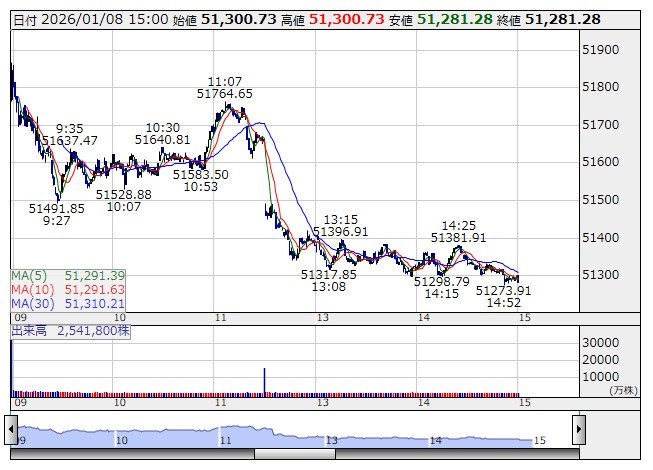 【市況】15時の日経平均は663円安の5万1298円、SBGが253.5円押し下げ