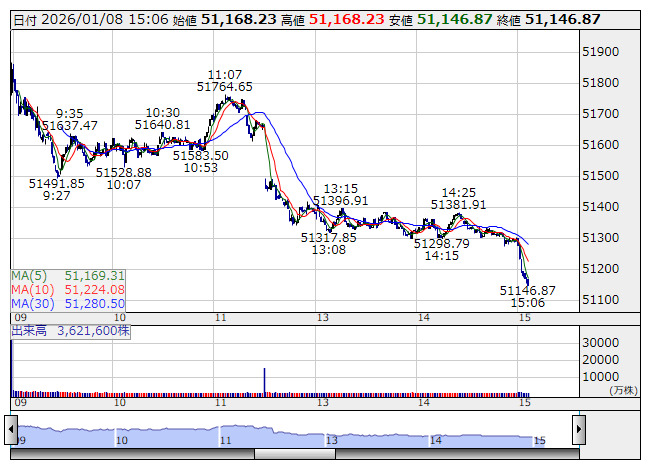 2026年01月08日15時07分 【市況】日経平均の下げ幅が800円を超える 日経平均 <1分足> 「株探」多機能チャートより 日経平均株価の下げ幅が800円を超えた。15時6分現在、808.31円安の5万1153.67円まで下落している。 株探ニュース