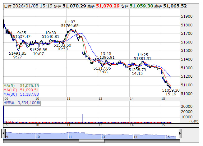 2026年01月08日15時20分 【市況】日経平均の下げ幅が900円を超える 日経平均 <1分足> 「株探」多機能チャートより 日経平均株価の下げ幅が900円を超えた。15時19分現在、902.68円安の5万1059.3円まで下落している。 株探ニュース
