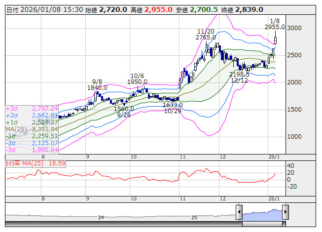 住友ファーマ <日足> ボリンジャー/カイリ率 「株探」多機能チャートより●株価が+3σを上回った銘柄(市場人気順) ★株価の上げ足が速過ぎ、売りが出やすい銘柄