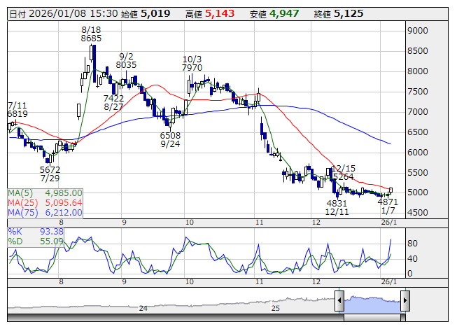 <8136> サンリオ 5125 +144 ( +2.9%) 5095.6