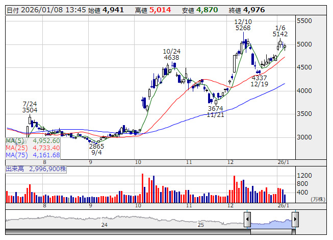 安川電 <日足> 「株探」多機能チャートより1月9日の決算発表銘柄(予定) ★は注目決算
