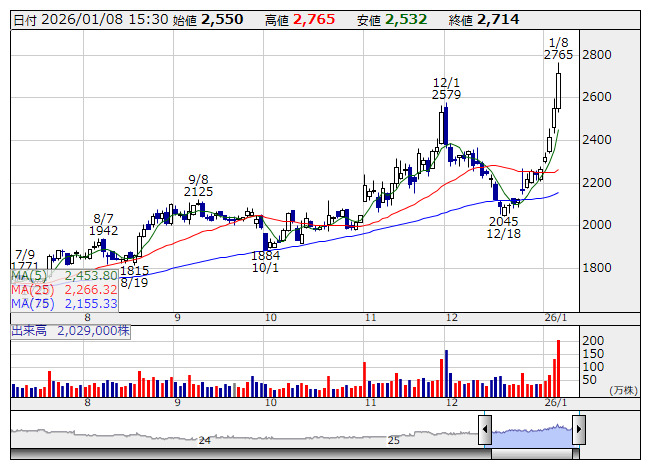 三井金属<5706>が大幅高で4連騰。同社は7日、機能材料事業説明会を開催し、資料をホームページに掲載した。このうち銅箔事業に関して、AIサーバーや情報通信インフラ向け需要の拡大が見込まれるなどとして、同事業のセグメント利益について2030年度には今年度比で約2倍の利益規模を見込んでいると明らかにしており、内容を評価した買いが集まった。半導体パッケージ向け特殊銅箔の「マイクロシン」はAIサーバーなど情報通信インフラ向けに需要が拡大。高水準の受注を継続しており、今後は高速光トランシーバー向けなど新分野での採用拡大も見込む。高周波通信インフラ向け銅箔に関しては、スーパーハイグレードとなるHVLP5カテゴリー品の「SI3-VSP」が最先端のAIサーバー向けに採用され、26年度以降もハイグレード銅箔の更なる需要拡大を予想。薄型基板内臓キャパシター材料「ファラドフレックス」もAIサーバーなどの分野で急速に採用が進展しているという。