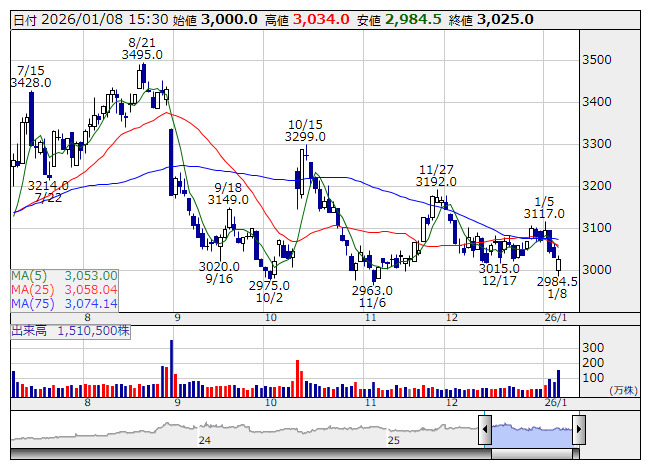 吉野家HD <日足> 「株探」多機能チャートより<9861> 吉野家HD 3025 -5