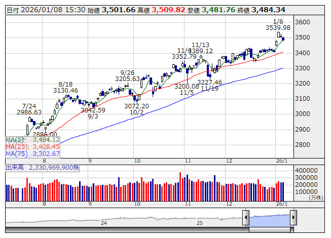 TOPIX <日足> 「株探」多機能チャートより日本取引所が公表した先物手口情報によると、1月8日のTOPIX先物期近(2026年3月限)の日中取引(立会内・J-NETの合算)で、取引高トップはABNクリアリン証券の2万1092枚だった。