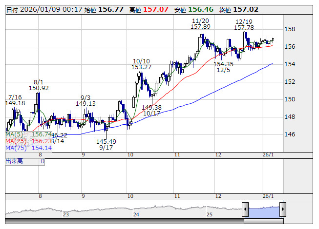 ドルは続伸。ドル・円は156円66銭から157円04銭まで上昇し、5日来の円安・ドル高を更新した。ユーロ・ドルは1.1678ドルから1.1656ドルまで下落し昨年12月10日来の安値を更新。ポンド・ドルは1.3447ドルから1.3416ドルまで下落した。