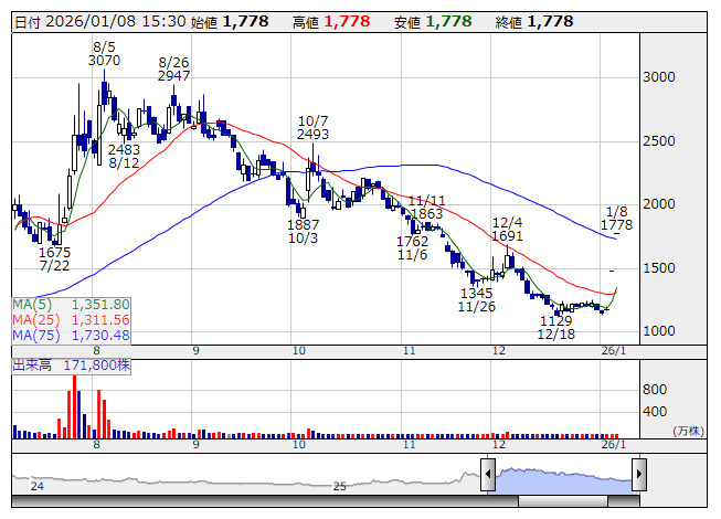 ブルーイノベ <日足> 「株探」多機能チャートより■ブルーイノベ <5597> 1,778円 (+300円、+20.3%) ストップ高