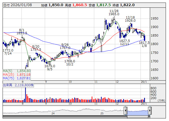 ニチレイ <日足> 「株探」多機能チャートより1月8日引け後に、株主優待制度について発表した銘柄を取り上げた。