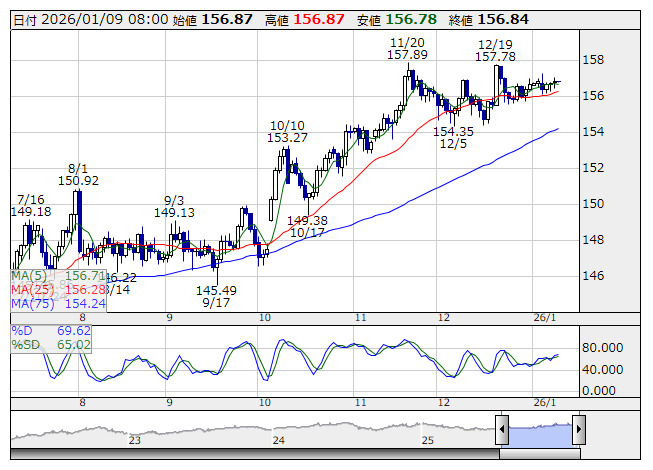 2026年01月09日08時01分 【通貨】外為:1ドル156円84銭前後とドル高・円安で推移 米ドル/円 <日足> Slowストキャス 「株探」多機能チャートより 9日の外国為替市場のドル円相場は午前8時時点で1ドル=156円84銭前後と、前日午後5時時点に比べ36銭のドル高・円安。ユーロ円は1ユーロ=182円87銭前後と13銭のユーロ高・円安で推移している。 株探ニュース