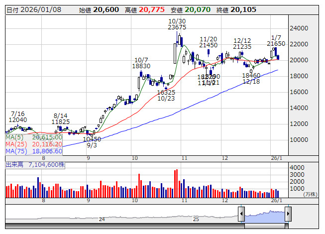 アドテスト <日足> 「株探」多機能チャートより(東証上場 4259 銘柄対象[ETF、REIT含む])