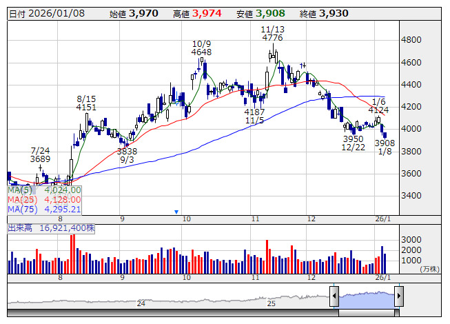 6503 (MIELY) 三菱電機 60.75 -0.50 4766 5