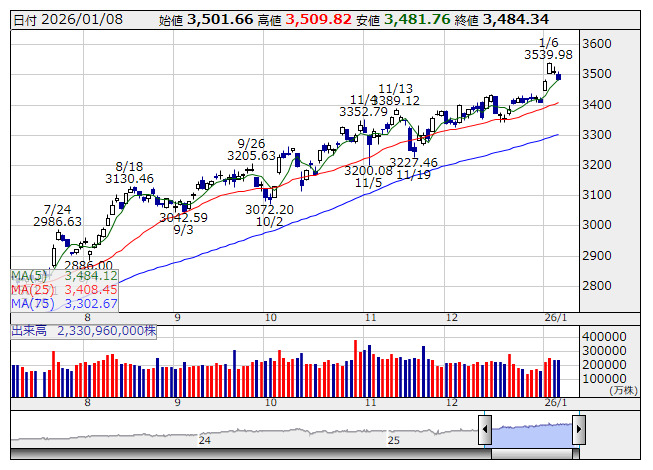 2026年01月09日08時46分 【市況】TOPIX先物:9日寄り付き=31.5ポイント高、3513ポイント TOPIX <日足> 「株探」多機能チャートより 9日8時45分、TOPIX先物期近2026年3月限は前日清算値比31.5ポイント高の3513ポイントで寄り付いた。前日のTOPIXの現物終値3484.34ポイントに対しては28.66ポイント高。 株探ニュース