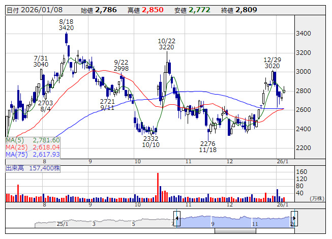 2026年01月09日08時47分 【テク】グロービング---25日・75日線とのゴールデンクロス示現 グロービング <日足> 「株探」多機能チャートより <277A> グロービング - - 足もとで調整が続くなか、75日線を支持線にリバウンドをみせてきた。25日線が上向きで推移しており、75日線とのゴールデンクロス示現。一目均衡表では雲下限までの調整を経て、その後のリバウンドで雲上限を突破してきた。雲上限は2748円辺りで横ばい推移が続くため、同水準を支持線としたリバウンド狙いのスタンスになりそうだ。 《FA》 提供:フィスコ