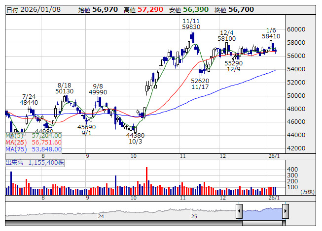 2026年8月期業績予想の修正を発表。営業利益を6100億円から6500億円に上方修正した。欧米を中心に海外のユニクロ事業が寄与しており、第1四半期の上振れ分を反映した。株価は56000円~58000円辺りでのレンジ推移を継続するなかで、25日線が支持線として意識されている。