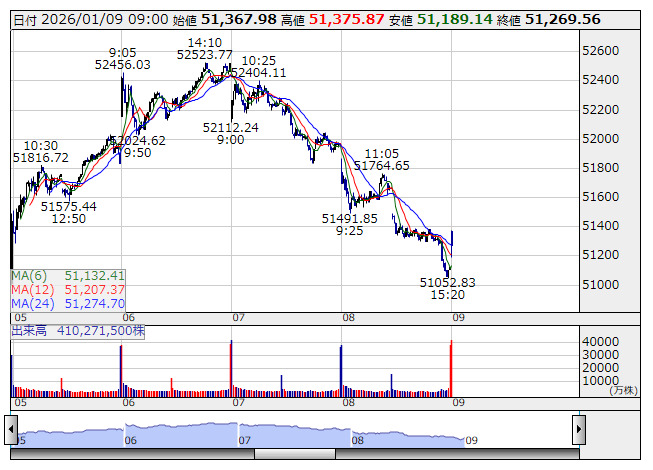2026年01月09日09時02分 【市況】日経平均9日寄り付き=250円高、5万1367円 日経平均 <5分足> 「株探」多機能チャートより 9日の日経平均株価は前日比250.72円高の5万1367.98円で寄り付いた。 株探ニュース