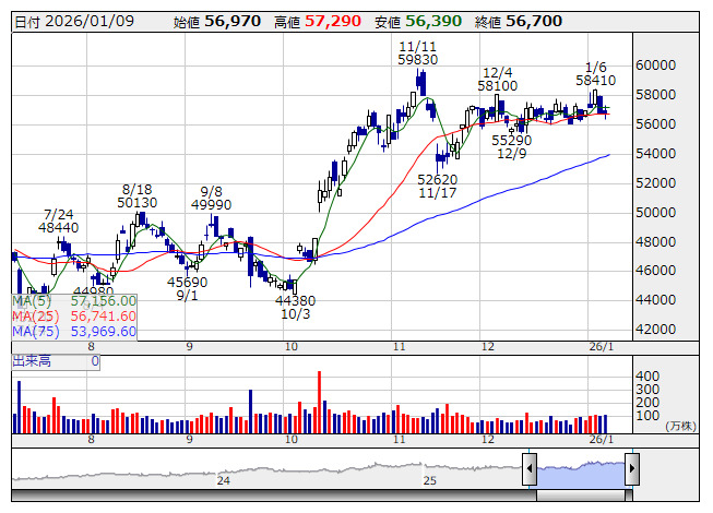 ファストリ <日足> 「株探」多機能チャートより1月9日9時03分31秒現在、特別買い気配は33銘柄、特別売り気配は10銘柄となっている。