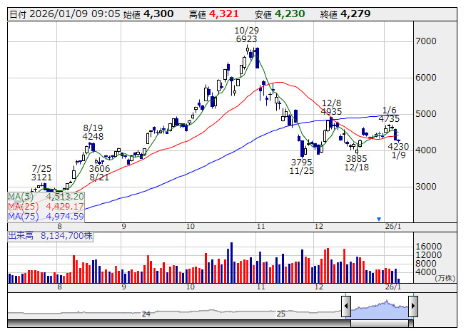 9984>は強弱観対立のなかも、やや売り優勢に傾いている。前日は7.6%安と急落し、日経平均のマイナス寄与度でトップとなったが、インデックス売りの直撃で下げ過ぎた感もある。きょうは、米国株市場でナスダック総合株価指数が軟調だったことは向かい風となるものの、深押し場面では値ごろ感からの押し目買いも想定されるところ。指数売買の影響から解放されるオプションSQ通過後の値動きが注目される。なお、株式需給面では信用買い残が直近データで1000万株以上積み上がった状態にあり、昨年6月下旬以来の水準まで膨張している。これが上値を重くする背景となっている。