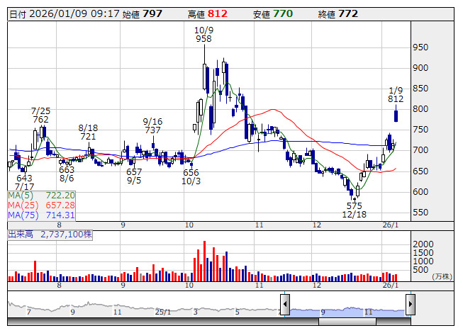 186A>がカイ気配スタートで、75日移動平均線を絡めた中段もみ合いを一気に上放れてきた。スペースデブリ(宇宙ゴミ)の除去を手掛けるほか、人工衛星の軌道上サービスを行うベンチャー。業績は営業赤字が続いているものの、トップラインの伸びが顕著で、26年4月期の売上高は前期比倍増を見込む。そうしたなか、8日取引終了後、同社の米子会社が米国航空宇宙局(NASA)の宇宙望遠鏡「Habitable Worlds Observatory(HWO)」への軌道上サービス提供の可能性を調査する新規案件に採択されたことを発表。NASAとの初の直接契約となる見込みで、これが株価を強く刺激する格好となった。
