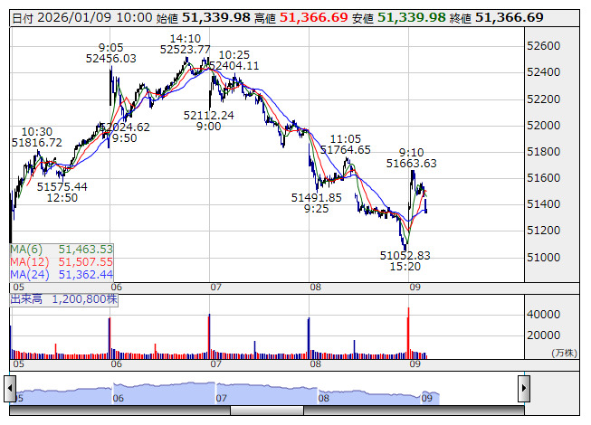 【市況】10時の日経平均は249円高の5万1366円、ファストリが388.27円押し上げ