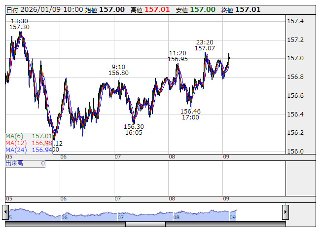 2026年01月09日10時01分 【通貨】外為:1ドル157円00銭前後と大幅なドル高・円安で推移 米ドル/円 <5分足> 「株探」多機能チャートより 9日の外国為替市場のドル円相場は午前10時時点で1ドル=157円00銭前後と、前日午後5時時点に比べ52銭の大幅なドル高・円安。ユーロ円は1ユーロ=182円97銭前後と23銭のユーロ高・円安で推移している。 株探ニュース