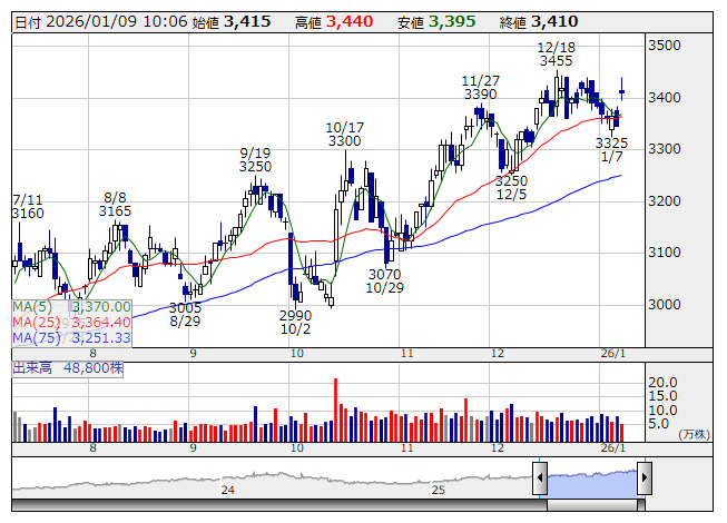 9948>が反発している。同社は8日の取引終了後、26年2月期第3四半期累計(3~11月)の連結決算を発表。売上高は前年同期比3.4%増の4647億7100万円、最終利益は同20.6%増の84億9800万円だった。9~11月期では最終利益は約36%増となっている。同社は北海道を地盤として食品スーパーを展開。物価高を背景に消費者の節約志向が強まるなかで、堅調な業績を示したことが評価された。既存店の客数は9月のみ前年割れとなったものの、それ以外は前年を上回って推移した。また、3~11月期の1人当たりの買い上げ点数は同2.0%減となったが、9~11月期は同1.4%減と改善傾向を示している。3~11月期の客単価は同2.6%増。店舗改装に関連する費用の節減を通じて販管費の増加を抑え、2ケタ増益を確保した。