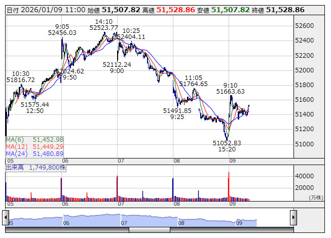 【市況】11時の日経平均は387円高の5万1505円、ファストリが400.30円押し上げ