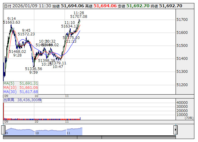 【市況】日経平均9日前引け=3日ぶり反発、575円高の5万1692円