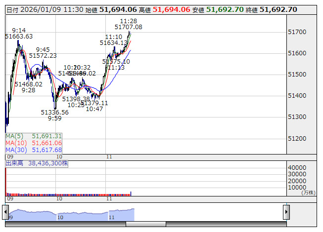 日経平均 <1分足> 「株探」多機能チャートより日経平均株価は反発。前日の米株式市場は、NYダウが270ドル高の4万9266ドルと上昇。景気敏感株や防衛関連株などが買われた。NYダウが上昇した流れを受け、東京株式市場も値を上げて始まった。特に、前日取引終了後に今期業績予想の上方修正を発表したファーストリテイリング<9983>が大幅高となり全体相場を押し上げた。銀行や自動車株などが値を上げ、非鉄株などが軟調に推移した。なお、日経平均先物ミニ・オプション1月物の特別清算指数(SQ)値は5万1525円23銭だったとみられている。