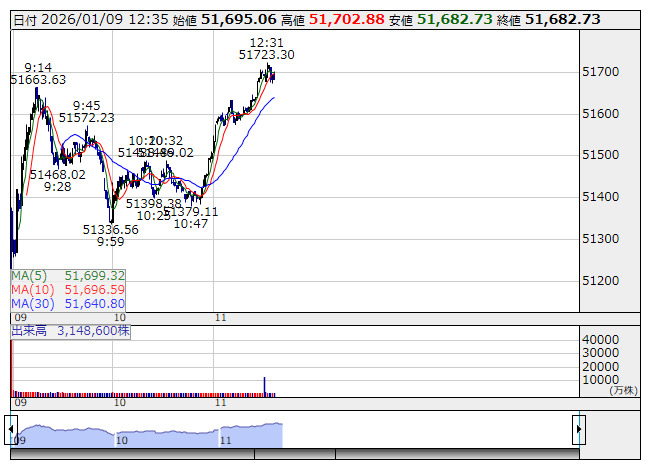 2026年01月09日12時34分 【市況】東京株式(後場寄り付き)=日経平均株価はやや上昇幅拡大 日経平均 <1分足> 「株探」多機能チャートより 後場寄り付きの東京株式市場では、日経平均株価が前日比600円高前後と前場終値からやや上昇幅は拡大している。外国為替市場では、1ドル=157円20銭近辺での値動きとなっている。 出所:MINKABU PRESS