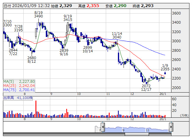 2026年01月09日12時34分 【材料】ウェルネスが大幅続伸、1株から2株への株式分割と配当予想の実質増額を好感 ウェルネス <日足> 「株探」多機能チャートより ウェルネス・コミュニケーションズ<366A>が大幅続伸している。8日の取引終了後に、1月31日を基準日として1株を2株に株式分割すると発表したことが好感されている。投資単位当たりの金額を引き下げることで、株式の更なる流動性の向上と投資家層の拡大を図ることが目的という。また、株式分割に伴い、26年3月期の期末一括配当予想を42円77銭から21円40銭へ実質増額修正した。 出所:MINKABU PRESS