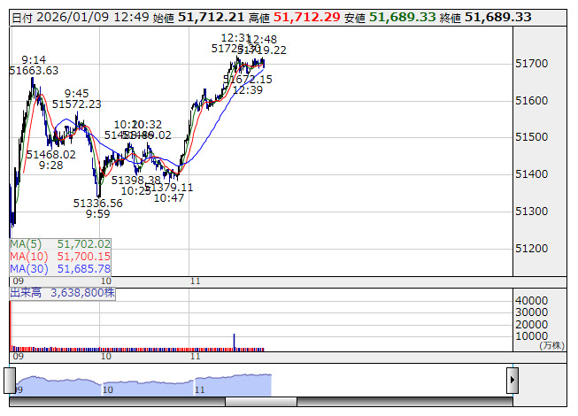 米株市場を横目に、1月9日の日経平均は250.72円高の51367.98円と3日ぶり反発して取引を開始した。その後はプラス圏で堅調推移となった。昨日の米株式市場は主要指数が高安まちまちだったが、外為市場で前日終値時点から円安・ドル高水準となっていることも安心感となった。また、日経平均は昨日までの続落で1400円下落しており、押し目待ちや自律反発狙いの買いも入りやすかった。