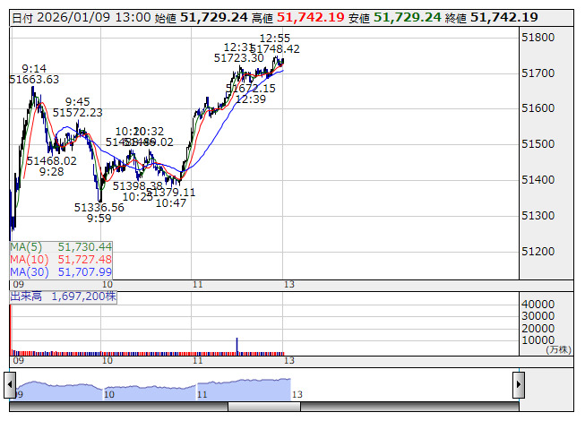 【市況】13時の日経平均は608円高の5万1725円、ファストリが413.94円押し上げ