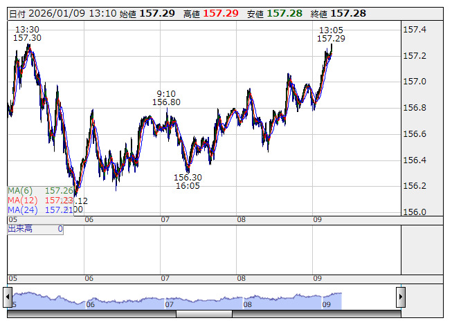 米ドル/円 <5分足> 「株探」多機能チャートより9日午後の東京市場でドル・円は小高く推移し、157円28銭まで上値を伸ばした。当面の上値メドとして意識されていた157円を上抜け、上昇基調を維持する。日経平均株価は後場上げ幅を拡大しており、日本株高を好感した円売りが続く。