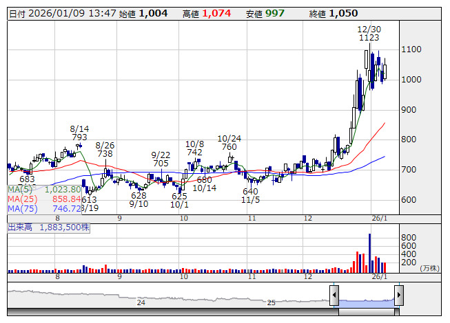 東邦鉛 <日足> 「株探」多機能チャートより東邦鉛は3日ぶり反発。昨年12月中旬を境に急速人気化の経緯をたどり、大納会の12月30日に1123円の昨年来高値形成後はいったん調整局面に入っていた。しかし、1000円大台を割り込んだ水準では押し目買いニーズが強い。鉛及び銀製錬の大手で、ここ銀市況が史上最高値圏に浮上するなか、同社は市況高の恩恵が期待できるとの見方から、短期資金による買い攻勢の対象となった。足もとで信用買い残が急増(12月26日現在で117万株)しており、需給面で重石になっているとの見方もあるが、これも売買高が大きく膨らめばこなせる可能性が高い。