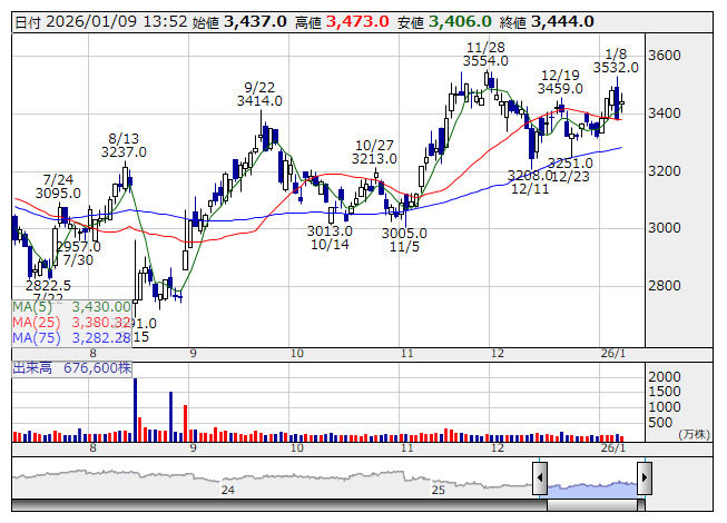 電通グループ <日足> 「株探」多機能チャートより■財務省 : 1月9日受付