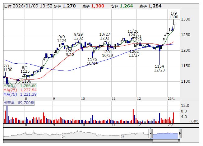 SMINOE <日足> 「株探」多機能チャートより同社はカーペットや自動車内装材の製造・販売などを手掛けている。11月中間期は自動車・車両内装事業の鉄道・バス向けで需要の回復が続いた。インテリア事業では製品の提案に留まらず「空間」全体のデザインに取り組むスペースデザインビジネスが大幅に伸長。増収に加え、価格改定効果の浸透なども営業増益に貢献した。