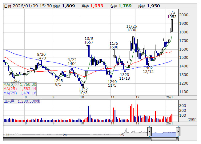 アストロスケールホールディングス<186A>=75日移動平均線を絡めた中段もみ合いを一気に上放れる。スペースデブリ(宇宙ゴミ)の除去を手掛けるほか、人工衛星の軌道上サービスを行うベンチャー。業績は営業赤字が続いているものの、トップラインの伸びが顕著で、26年4月期の売上高は前期比倍増を見込む。そうしたなか、8日取引終了後、同社の米子会社が米国航空宇宙局(NASA)の宇宙望遠鏡「Habitable Worlds Observatory(HWO)」への軌道上サービス提供の可能性を調査する新規案件に採択されたことを発表。NASAとの初の直接契約となる見込みで、これが株価を強く刺激する格好となった。