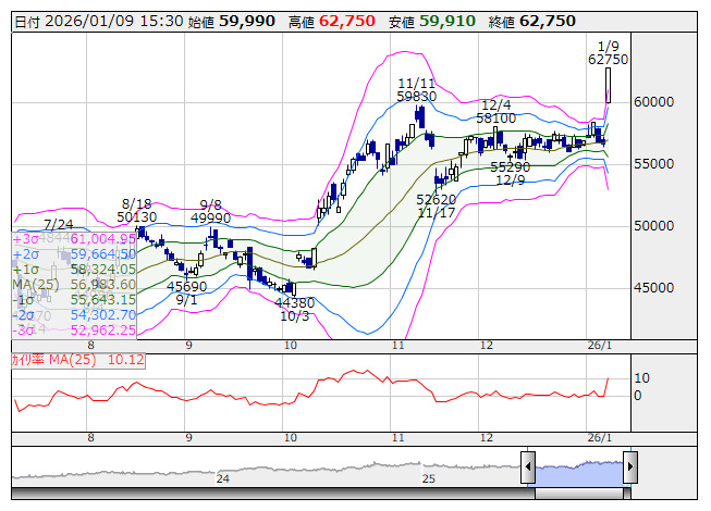 【テク】本日の【ボリンジャー|±3σブレイク】引け 上抜け= 68 銘柄 下抜け= 6 銘柄 (1月9日)