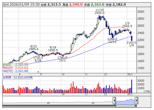 以下に挙げたのは、決算発表が「マイナス・インパクト」となった可能性のある東証プライムの銘柄である。株価が決算発表前日の1月7日から8日の決算発表を経て9日大引け現在、水準を切り下げている銘柄を下落率の大きい順にランキングした。