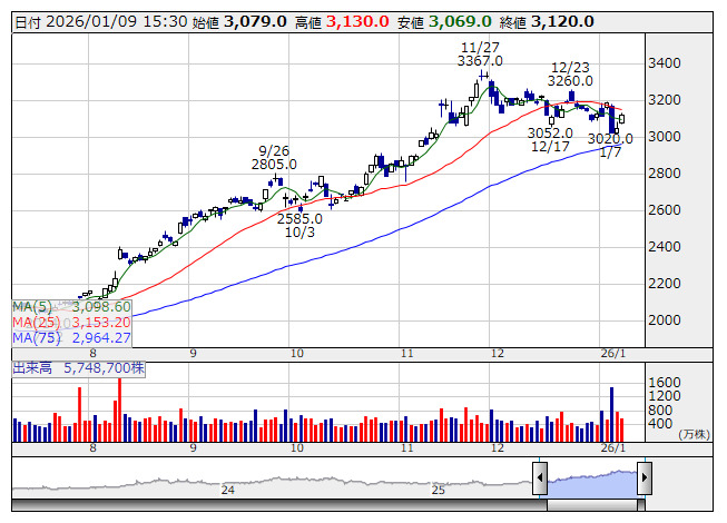 オンワードホールディングス<8016>が3日ぶりに反発。8日の取引終了後に発表した第3四半期累計(3~11月)連結決算が、売上高1747億2500万円(前年同期比16.5%増)、営業利益95億2900万円(同11.3%増)、純利益76億3500万円(同32.1%増)と2ケタ増収増益となったことが好感された。オンワード樫山やオンワードパーソナルスタイルの冬物衣料の販売が好調に推移し、特に「アンフィーロ」「カシヤマ」「チャコット・コスメティクス」などの戦略強化ブランドが好調だった。また、広告宣伝費など販管費の効率化や在庫管理の徹底などに取り組んだことも奏功した。なお、26年2月期通期業績予想は、売上高2300億円(前期比10.4%増)、営業利益115億円(同13.3%増)、純利益100億円(同17.4%増)の従来見通しを据え置いている。同時に発表した25年12月度の月次売上概況は、既存店売上高が前年同月比3.6%減と3カ月ぶりに前年実績を下回った。前年よりも休日数が1日少なかったことが影響したほか、気温が高めの日が多かったことで冬物のプロパー販売が伸び悩んだ。