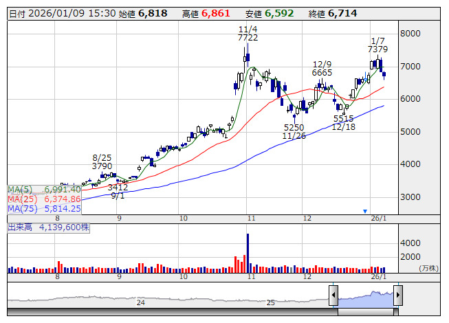 イビデン <日足> 「株探」多機能チャートより■財務省 : 1月9日受付