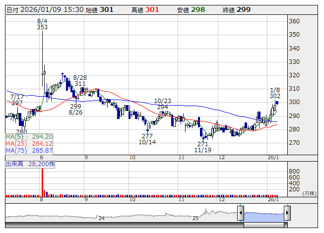 わかもと <日足> 「株探」多機能チャートより■財務省 : 1月9日受付