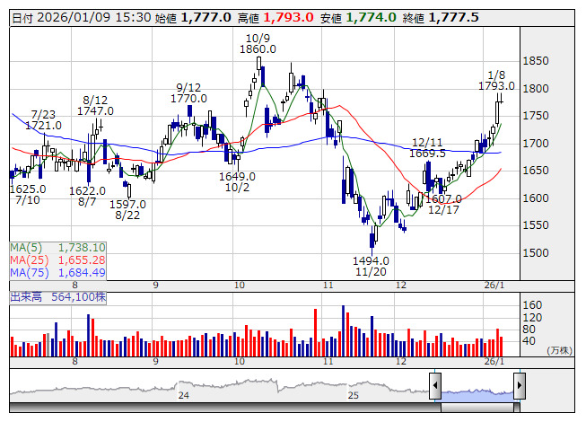 日本光電 <日足> 「株探」多機能チャートより■財務省 : 1月9日受付