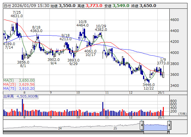 カプコン <日足> 「株探」多機能チャートより■財務省 : 1月9日受付