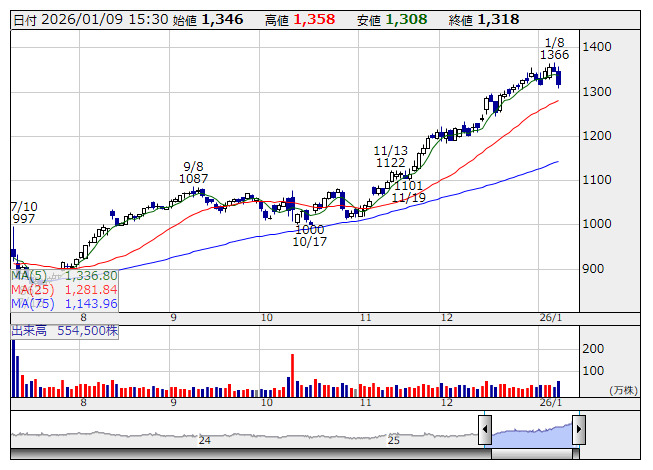 乃村工芸社 <日足> 「株探」多機能チャートより◆今期【最高益】を予想する銘柄(サプライズ順)