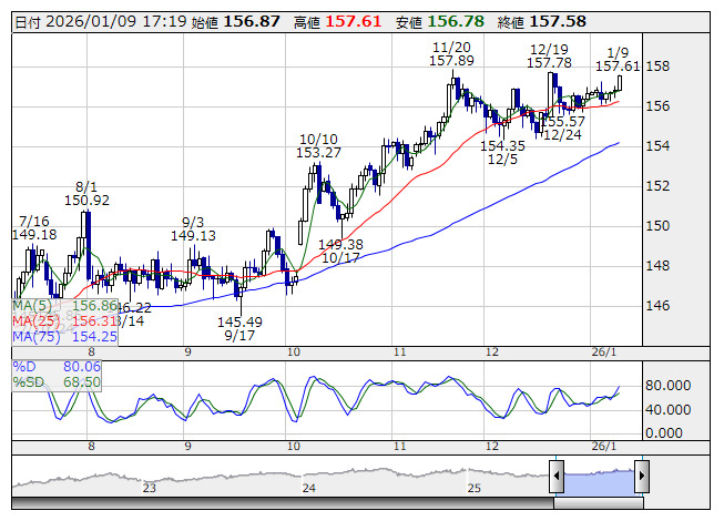 米ドル/円 <日足> Slowストキャス 「株探」多機能チャートより9日の東京市場でドル・円は堅調。日経平均株価の堅調地合いでリスク選好の円売りに振れ、朝方の156円82銭から上昇基調に。当面の上値メドと意識されていた157円を上抜けるとドル買い・円売りが進み、夕方は157円59銭まで上値を伸ばした。