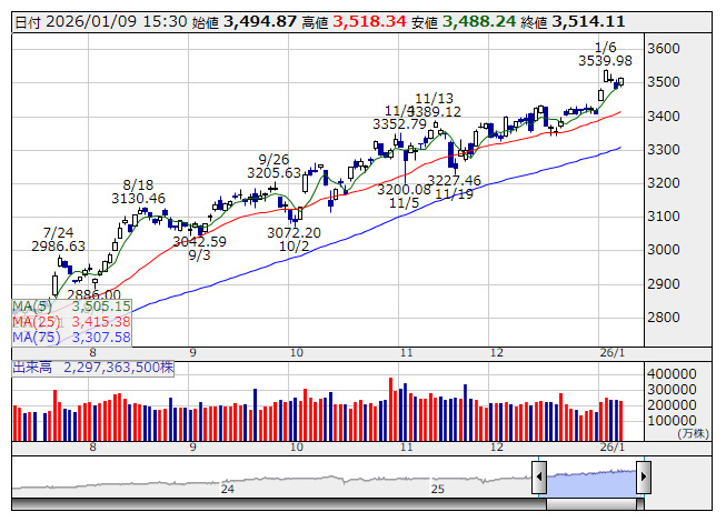 TOPIX <日足> 「株探」多機能チャートより日本取引所が公表した先物手口情報によると、1月9日のTOPIX先物期近(2026年3月限)の日中取引(立会内・J-NETの合算)で、取引高トップはABNクリアリン証券の1万7411枚だった。