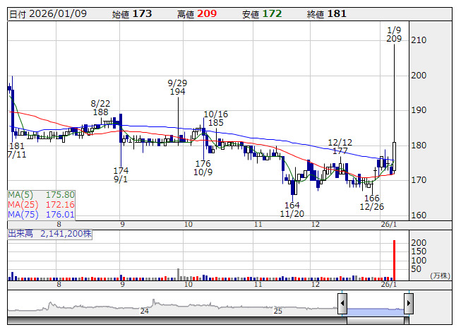 ポプラ <日足> 「株探」多機能チャートより1月9日に、株主優待制度について発表した銘柄を取り上げた。